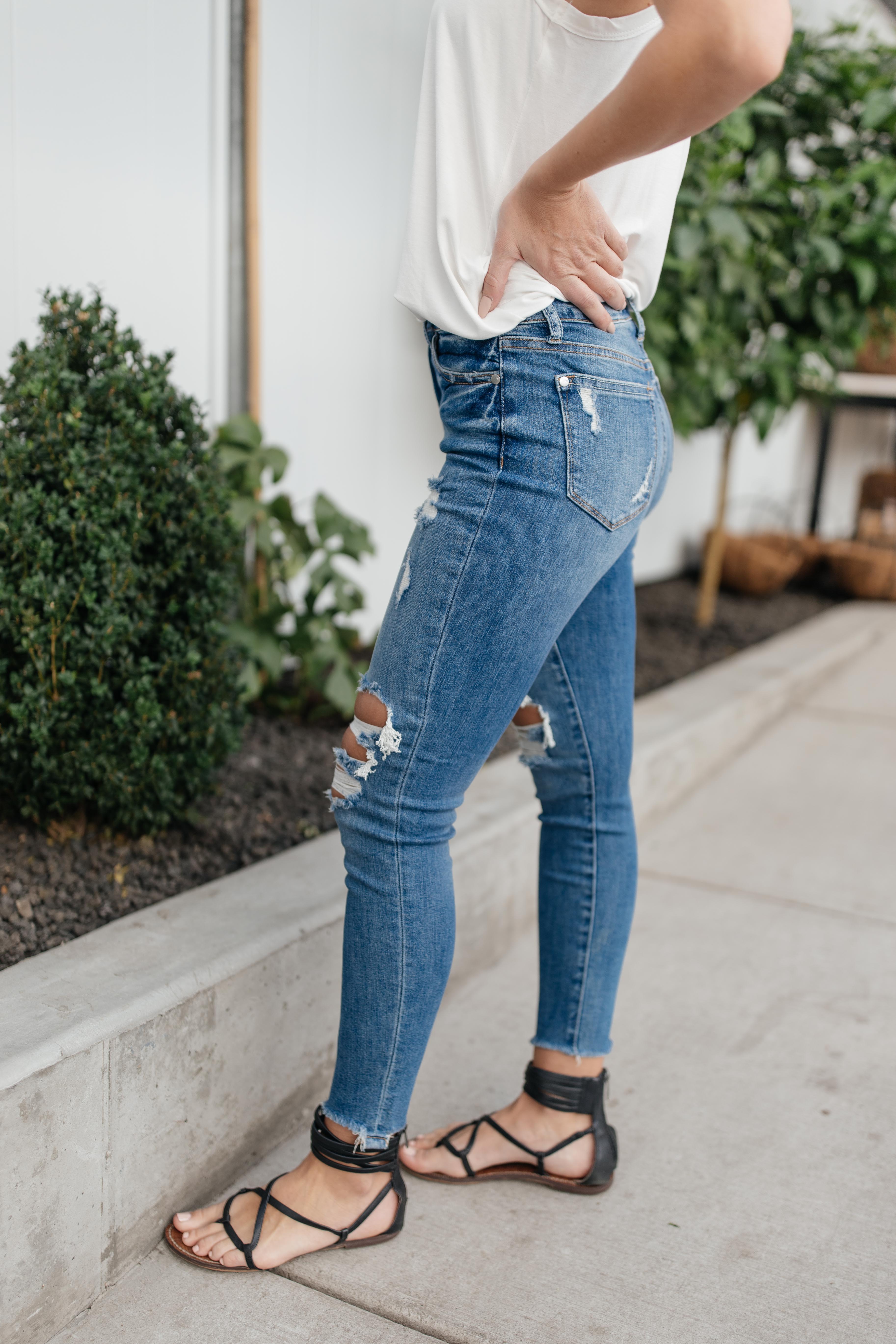 These light-wash Judy Blue jeans are on-trend, stretchy, and feature distressing "just at the knee". You'll love how these pants hug and highlight your curves. They move freely as you do and they're the perfect shade of denim to style with all year long.