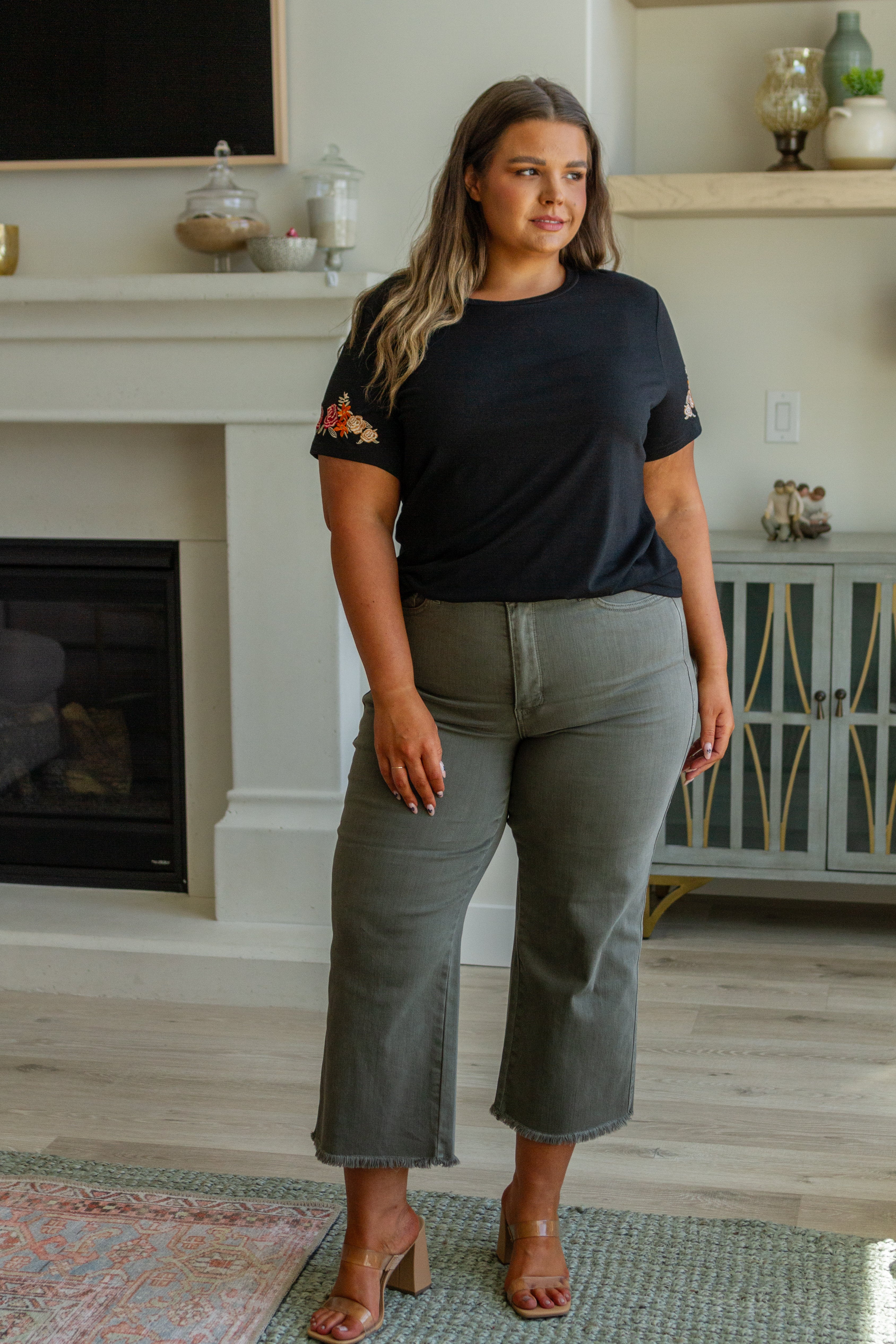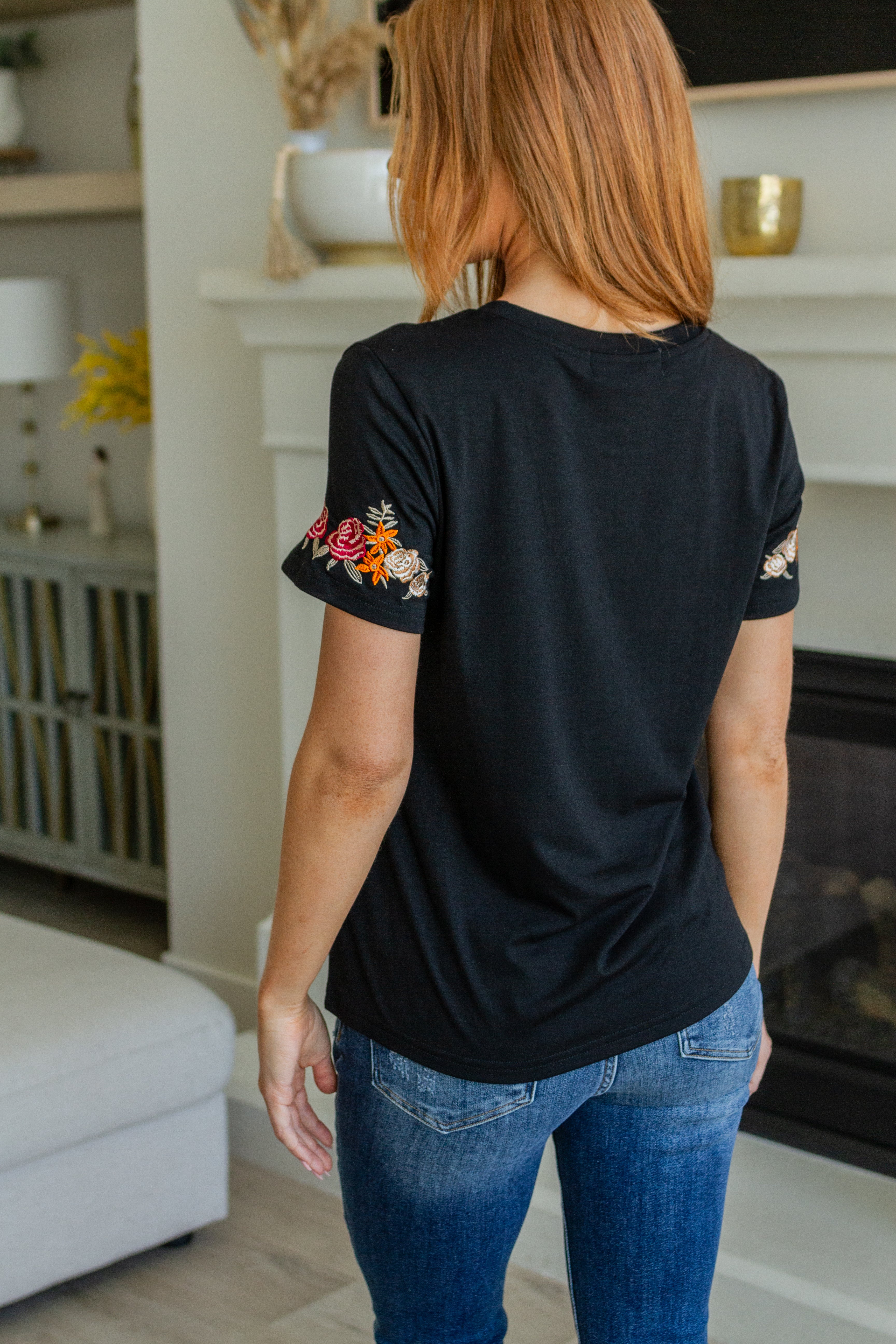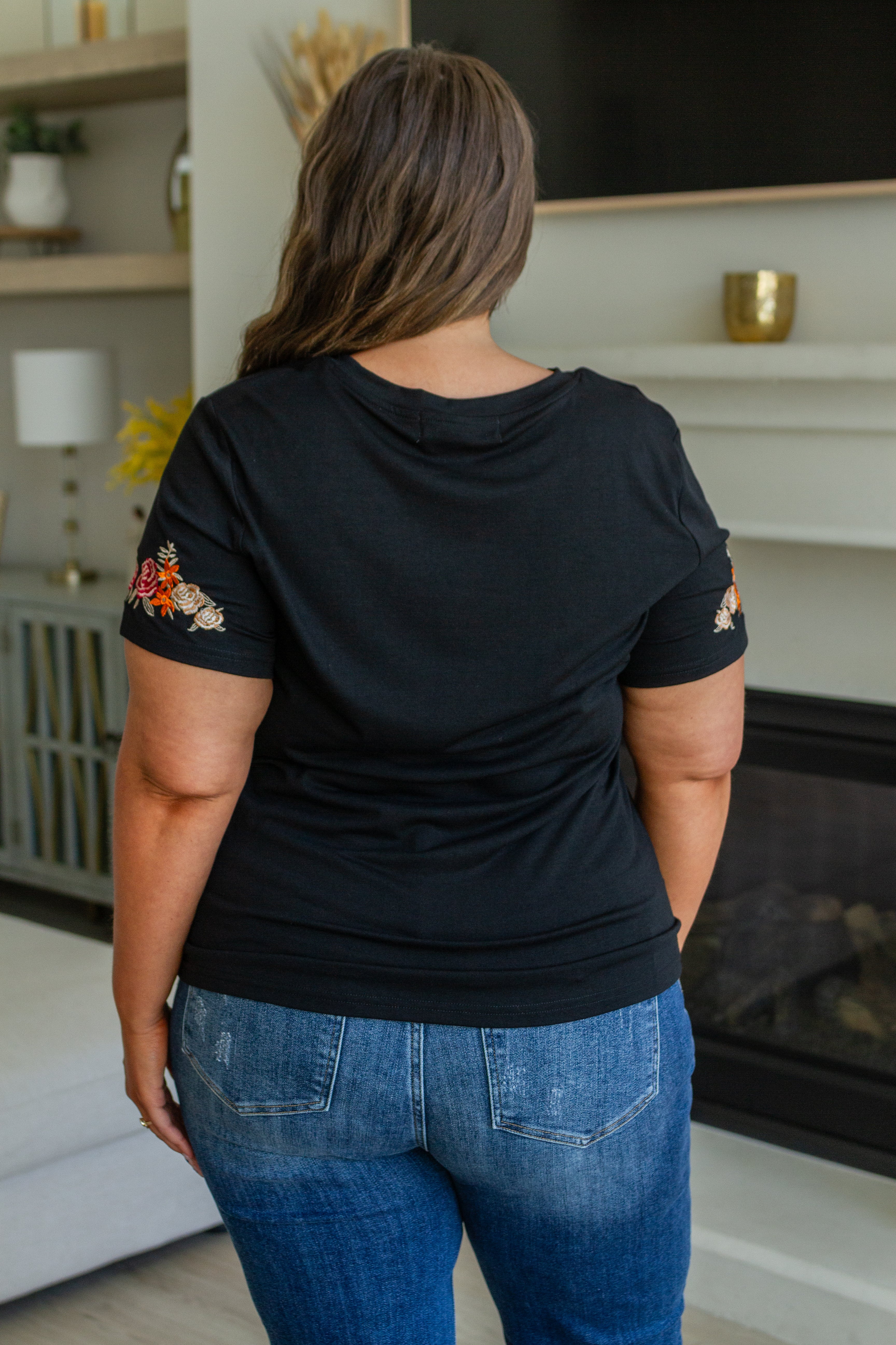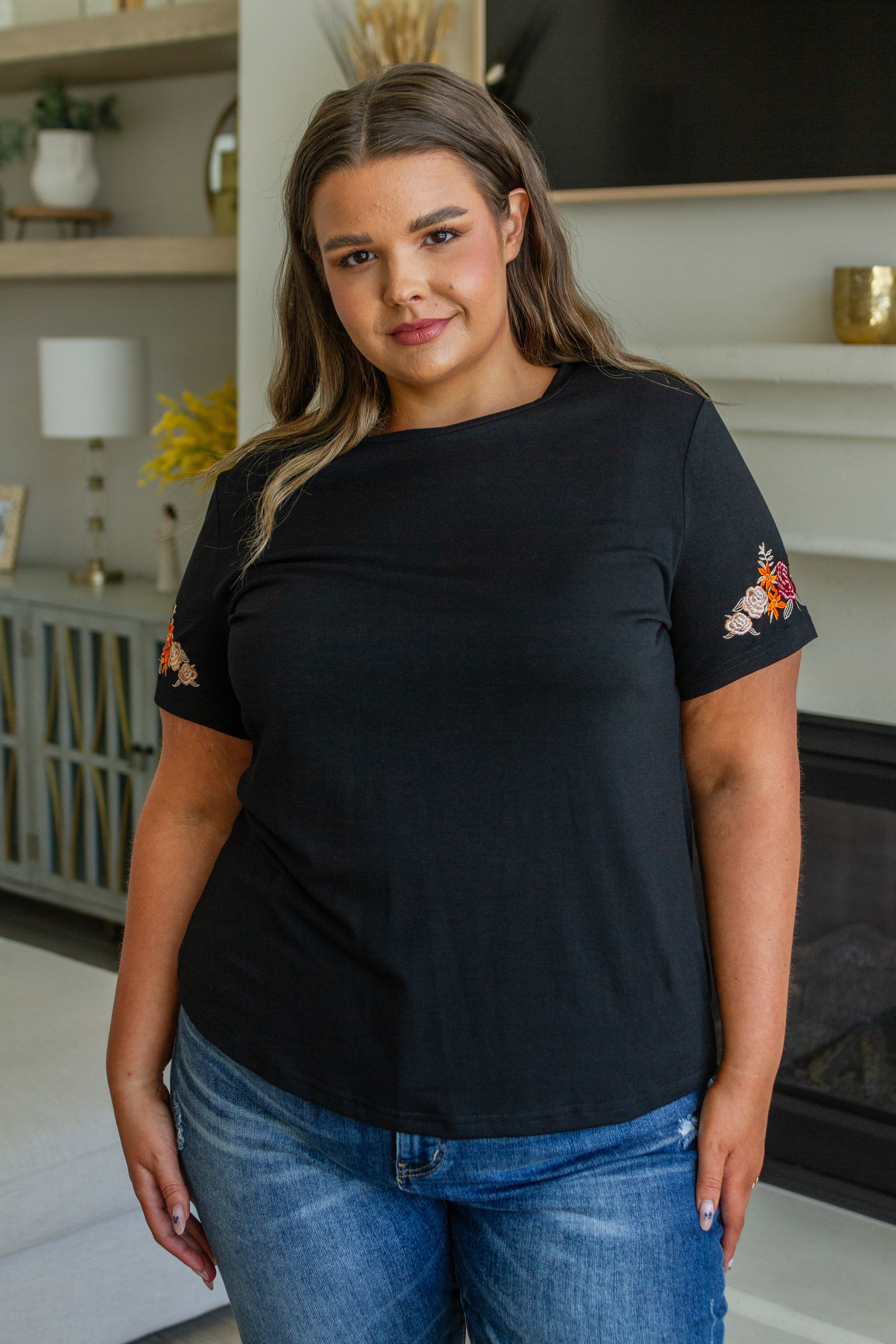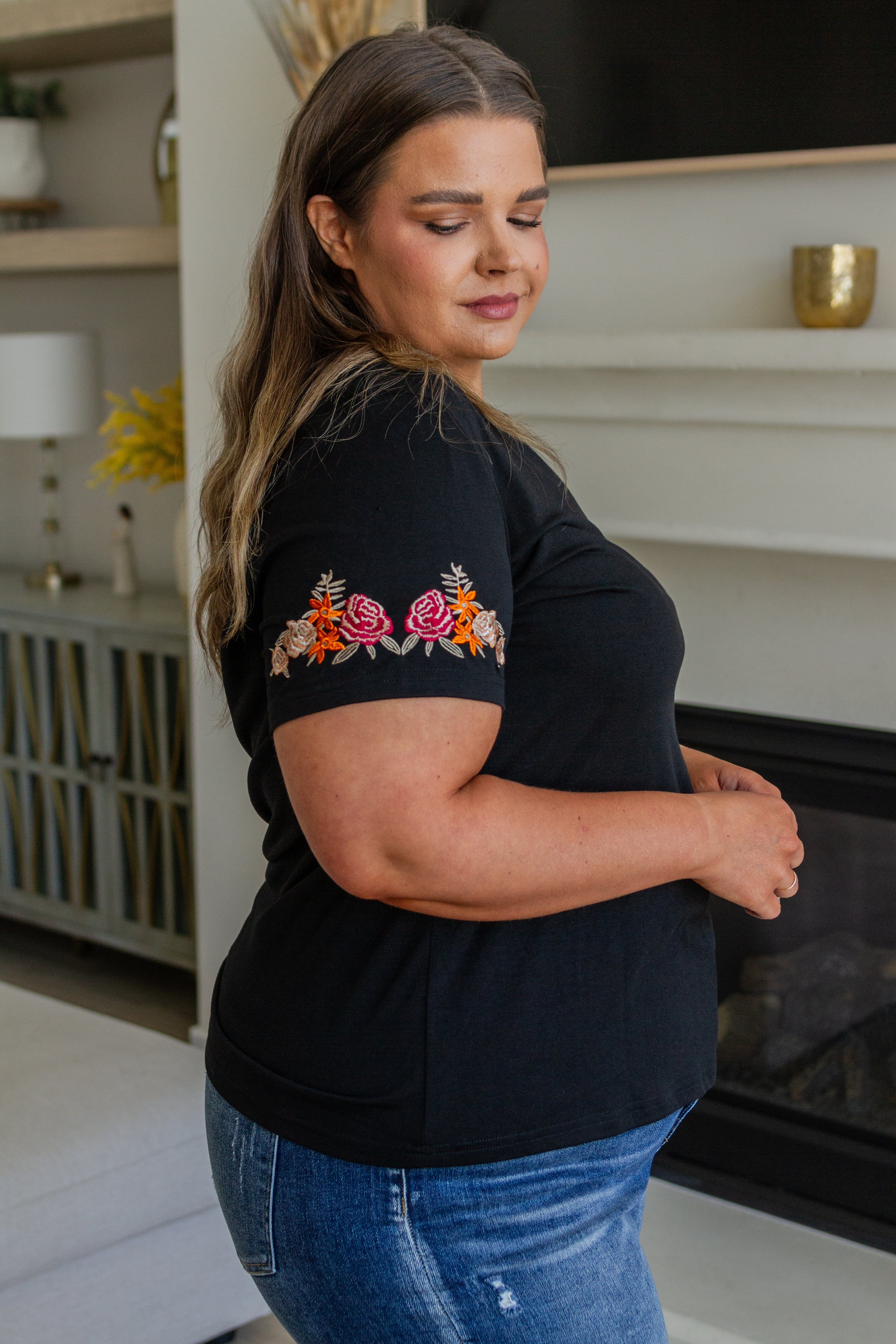 Fall in love with the beautiful Roses On My Sleeves Embroidered Top. Crafted in Jersey Knit for a relaxed fit, it's embellished with gorgeous embroidered roses on the sleeves for a romantic touch. Graceful and stylish, this comfortable top is the perfect way to elevate any look.